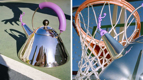 The 3909 kettle mixes different cultural aspects: the phenomenon of basketball and its multicultural imagery, an integral part of Virgil Abloh's personal history, with the world of design and its codified references. The whistle is completely redesigned, taking the form of a basketball player who crushes with power to the basket, while the colours of the handle and the knob are lit with an intense purple.