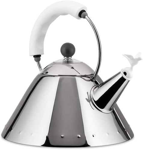 It's no surprise that the Alessi Kettle with Bird Whistle has sold more units than any other item in Alessi history. Designed by Michael Graves in 1985, the Alessi bird kettle has a youthful personality and a simple geometry, allowing it to heat faster than other kettles thanks to its tapered stainless steel body and spout. The bird spout cheerfully whistles when the water has reached a boil.