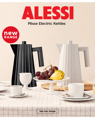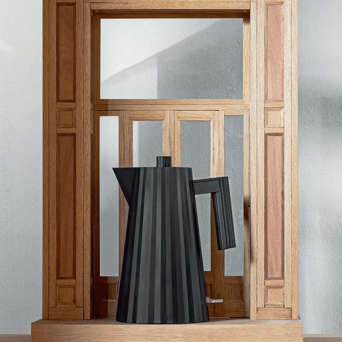 Michele De Lucchi's design for Alessi's Plissé Electric Kettle elevates an everyday object into a useful sculptural accent for the modern kitchen. Made of black thermoplastic resin, the crisp pleats create a lovely play of light and shadows. With 1500 watts for quick boiling, a removable filter for easy cleaning, an automatic shut-off, and a cord-free base, the Plissé is as functional as it is fabulous.