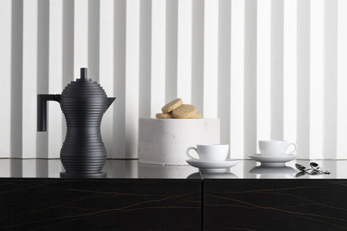Pulcina comes from a research entirely dedicated to the design and functionality of the espresso coffee maker. As a result of this study and the application of the technology developed by illycaffè, Pulcina is a high performance coffee maker with a boiler that stops dispensing the drink at the right time before the coffee gets a bitter aftertaste. This helps to enhance the full and rich aroma of this drink. The spout has been designed with the same attention to functional aspects: when pouring coffee, its special V shape, which recalls a chick's beak (hence the name of the coffee maker) allows it to perfectly stop the drop. The handle and plastic knob in colours black and red complete the coffee maker.