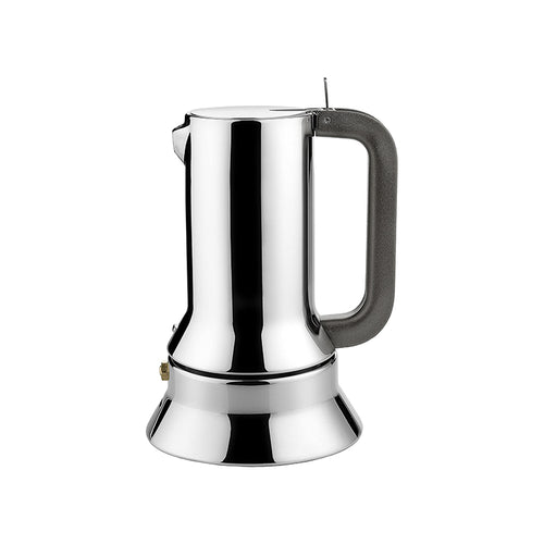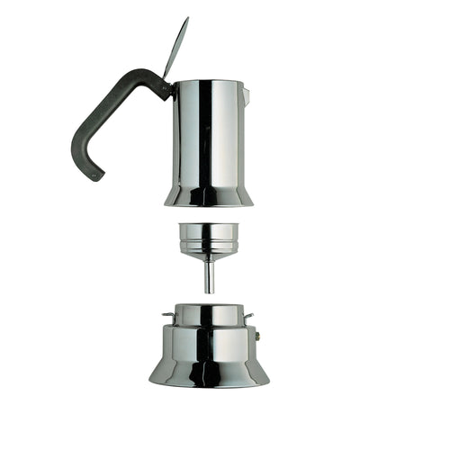Three-cup espresso coffee maker, in 18/10 stainless steel with cast iron handle. The 9090 isn't just the first espresso coffee maker in Alessi's history: it was also Alessi's first object for the kitchen after the 1930s, the first of Alessi's many Compasso d'Oro awards (1979), Alessi's first object to be inducted into the Permanent Design Collection at the New York MOMA, and of course it's the best-loved Alessi coffee maker bar none, as well as Alessi's first "amphibious object", i.e. it is for kitchen use, but with its high design quality it can also be brought directly to the table.