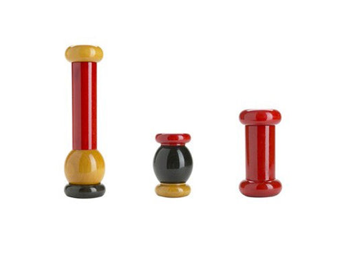 A salt, pepper and spice grinder in beech-wood designed with unique voluminous shapes and bright colours typical of Ettore Sottsass’s style.