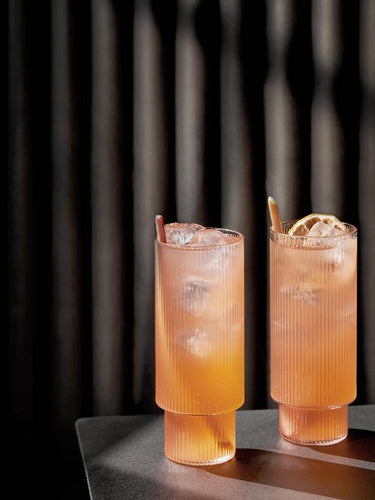 Channelling a sophisticated feel with their rippled surface of the mouth-blown glasses, the Long Drink Glasses are a natural part of an evening in good company. Individually shaped geometric forms are the foundation of this dynamic glass series, equally aesthetic and functional. Pour in your favourite drink and watch as an iridescent play of light and textures appears in the ripples of the glasses.