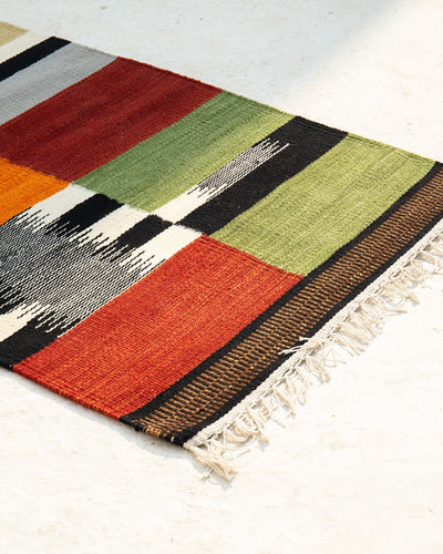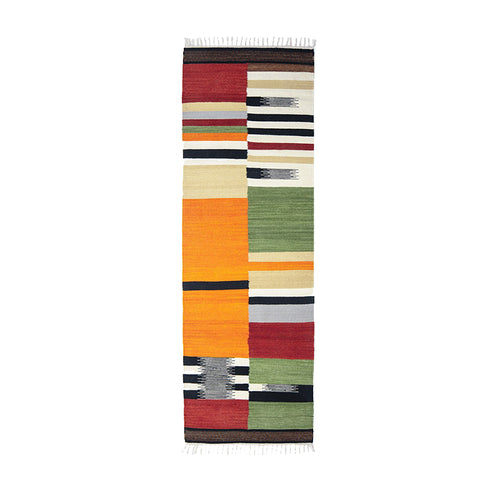 CHANTERELLE is a Kilim rug. Kilim is the name for a thin, flat, tapestry-woven, graphic style rug. It is made by weaving the horizontal yarn (weft) through vertical yarn (warp). The rug is woven so tightly that the warp is barely visible. This makes for a very durable rug, that can handle weight and movement.