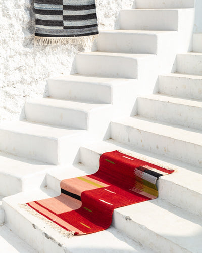 ROSE GARDEN is a Kilim rug. Kilim is the name for a thin, flat, tapestry-woven, graphic style rug. It is made by weaving the horizontal yarn (weft) through vertical yarn (warp). The rug is woven so tightly that the warp is barely visible. This makes for a very durable rug, that can handle weight and movement.