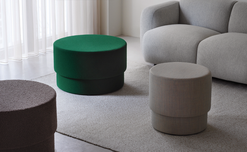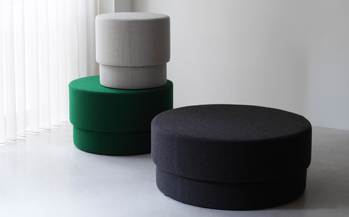 The poufs are available in three sizes, Ø50, Ø70 and Ø90 cm, and can be upholstered in a wide variety of textiles and leathers in many different color options.
