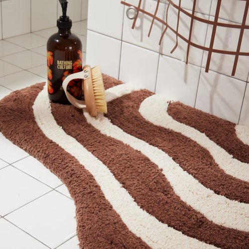 Introducing The Lost Coast, Quiet Town's first high-pile bath rug designed with an undulating shape to fit in small spaces. Each end is tapered or rounded to make room for bathroom fixtures and swinging doors. And while the rest of the rug carries an organic shape, the back side of Lost Coast can nest right against a tub or shower.