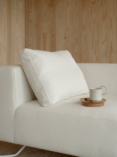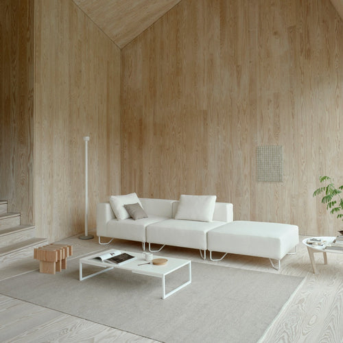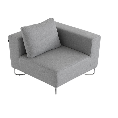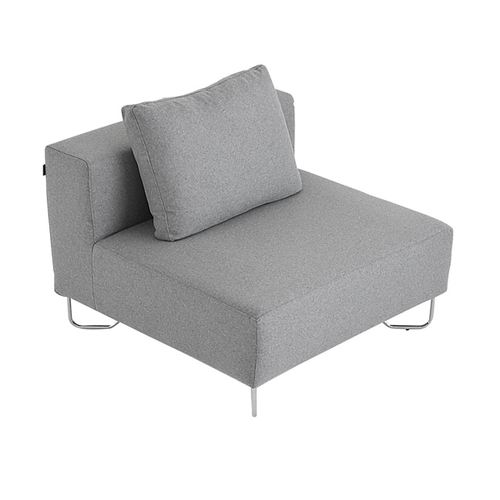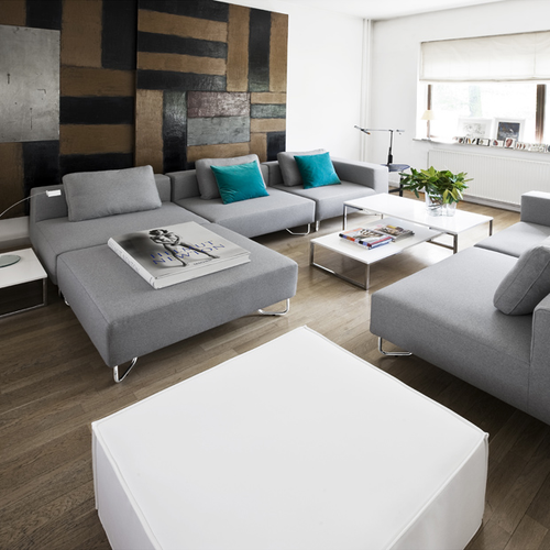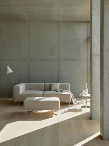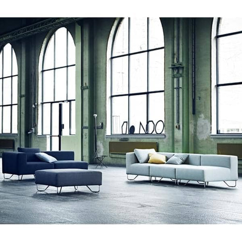 The Binning is a modular sofa system. It is comprised of 3 elements: A corner, single, and a footstool. The elements are purchased individually and are easily combined to create unlimited combinations. It therefore is suitable to both small and large spaces. Each piece is approximately a one meter cube, and therefore they fit together on all sides. For example, the corner can be rotated to be a left or a right. The elements also come with brackets which allow them to be held together on the underside.