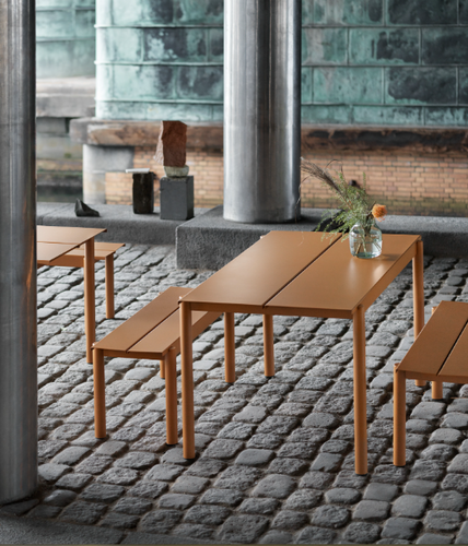 The Linear Steel Bench brings new perspectives to modern outdoor furniture through its straight lines alongside the folded edges, halfcircular intersecting legs and small spacing for easy removal of water. Kept visually clean for long-lasting aesthetics, the Linear Steel Bench finds its distinct character through subtle detailing and a simple expression, allowing for it to complement any outdoor setting. The Linear Steel Bench is designed in proportions that allow for it to slide easily under the matching Linear Steel Table.
