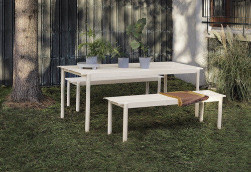 The Linear Steel Bench brings new perspectives to modern outdoor furniture through its straight lines alongside the folded edges, halfcircular intersecting legs and small spacing for easy removal of water. Kept visually clean for long-lasting aesthetics, the Linear Steel Bench finds its distinct character through subtle detailing and a simple expression, allowing for it to complement any outdoor setting. The Linear Steel Bench is designed in proportions that allow for it to slide easily under the matching Linear Steel Table.