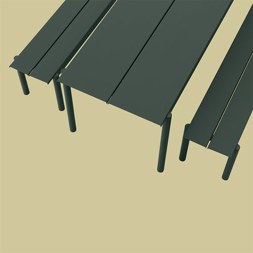 The Linear Steel Table brings new perspectives to modern outdoor furniture through its straight lines alongside the folded edges, halfcircular intersecting legs and small spacing for easy removal of water. Kept visually clean for long-lasting aesthetics, the Linear Steel Table finds its distinct character through subtle detailing and a simple expression, allowing for it to complement any outdoor setting. Pair the table with the Linear Steel Bench, designed in proportions that allow for it to slide easily under the table.
