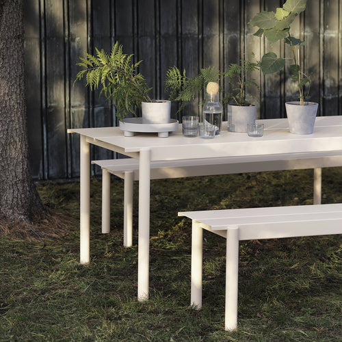 The Linear Steel Table brings new perspectives to modern outdoor furniture through its straight lines alongside the folded edges, halfcircular intersecting legs and small spacing for easy removal of water. Kept visually clean for long-lasting aesthetics, the Linear Steel Table finds it distinct character through subtle detailing and a simple expression, allowing for it to complement any outdoor setting. Pair the table with the Linear Steel Bench, designed in proportions that allow for it to slide easily under the table.