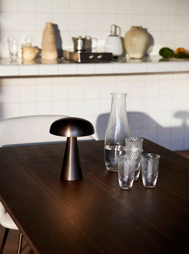 Match lighting to mood with Como SC53, a portable table lamp from Space Copenhagen. Crafted from anodized aluminium, Como’s sturdy base tapers up towards a softy curved, mushroom-shaped shade. This battery-powered lamp can operate for eleven hours at the highest setting, with an extra battery option that allows additional operating. It is easily recharged with a magnetic USB cable or a charging tray.