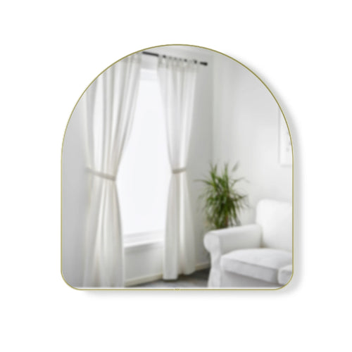 The Hubba Arched brings a unique arch shape to the standard mirror. Featuring soft curves and a thin metallic finish rim, use Hubba in your entryway, bedroom or other living spaces to add a decorative touch, while instantly brightening your space. Measuring, 34 x 36 inches (86 x 91 cm), this statement mirror can be leaned up against your mantle or mounted with included hardware. Hubba’s beautiful shape and frame allows it serve as not just a mirror but as decor for your walls