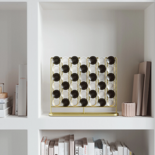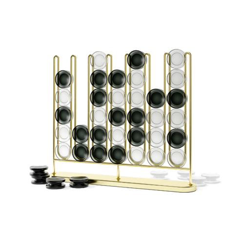 A fun game for any occasion, Stax Four-in-a-Row is perfect for all ages. With a metal plated finish and frosted playing pieces, this elevated twist on the classic game also doubles as a unique piece of decor to display in your home. Modern brass metal finish and frosted playing pieces create an eye-catching look on any table or counter space. The metal wire stopper keeps pieces and place and provides a simple, and decorative design.