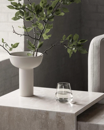 Blomus' Miyabi Ceramic Vase, inspired by the Japanese art of ikebana - the gentle and mindful arranging of flowers into sculptural bouquets. The Blomus vase is designed by Kazushige Miyake. MIYABI translates directly to elegance, grace or sophistication. What could be a more appropriate name for an ikebana vase? Ikebana considers not only the shapes, lengths and colors of the flowers and stems, but also the surface of the water, which is displayed in the wide top portion of the vase.