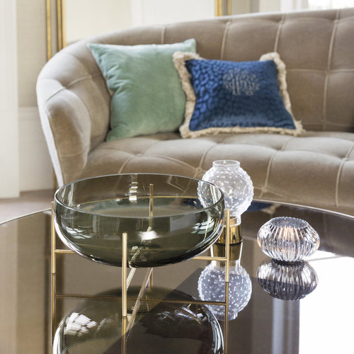 The Échasse Bowl—Available in two sizes in smoked glass and brushed brass, offers a modern, centerpiece-worthy take on the traditional serving bowl. Simple and purposeful, this is counter- and tabletop storage that is both modern and elegant.