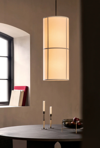 The collection’s pendant light is created with the same column-like shape as the floor and table lamp, carefully covered with translucent fabric that reveals the graphic structure within and suspended from the ceiling by a textile cord. Spreading ambient light in a room, it makes a purposeful pendant above a dining table, in a reception area or hotel bedroom.