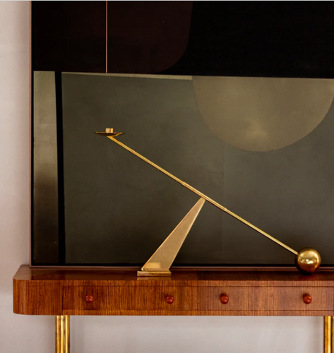 Interconnect Candle Holder is a bold and illuminating centrepiece of exaggerated proportions, designed for Audo Copenhagen by Colin King. As a source of cosy candlelight, it is characterised by its deceptively simple geometric form: a sphere, an angle and a line, which unite to create a unique design. Available in polished brass or painted steel, it goes beyond its intended use to function as a sculpture.