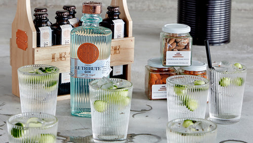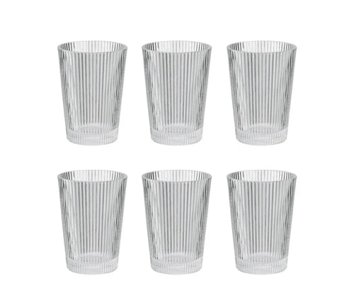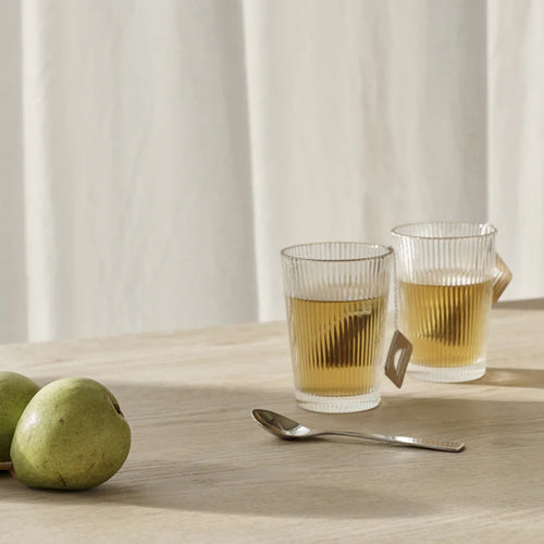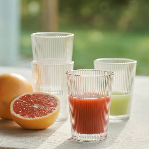 Due to the conical shape of the glasses they can be stacked and only take up little space in the cupboard or drawer. The design is inspired by the art deco style of the 1920s and the grooved surface of the glass makes water, juice and drinks look good. The glasses even support hot drinks like caffè latte and tea.