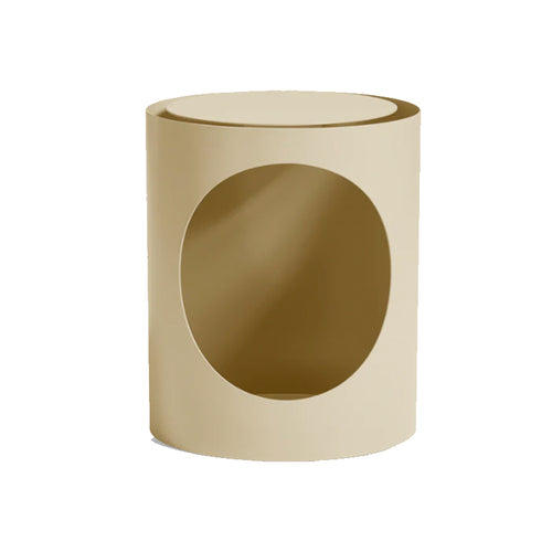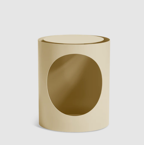 TABL is a graphic metal side table designed from the idea of optimising material by providing the design with a new function without adding additional material. A circular part of the classic cylindrical base has been cut out and transformed into a functional tabletop. Consequently leaving a round, open space in the foundation for storage of books, throws or creative pursuits.