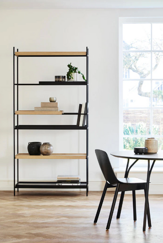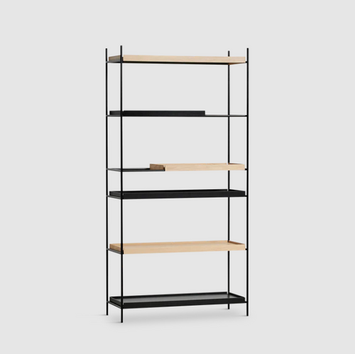 Material: Frame: Black painted metal, Trays: Black painted oak and white pigmented oak, Endcaps: Black plastic