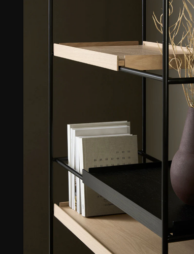 Tray Shelf is a vivid shelving system with straight lines, aesthetic symmetry and simple expression. Designed to create various possible arrangements of the tray making the shelving system dynamic and personal by choosing your favourite tray combination. Take the trays and place them on the different levels in the frame. Gaps in the shelving system are created by moving the small trays, which allow taller objects to be placed in the open space.
