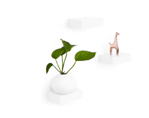 Looking for a unique way to display your trophies or favorite collectables? Or perhaps you need a spot to keep small everyday items, such as your cellphone or car keys, in a space that's too small for a conventional table? Introducing Showcase Floating Shelves by Umbra. Featuring 3 gallery-style floating shelves that can be mounted to your wall in any configuration, Showcase shelves are perfect for displaying important items such as trophies, vinyl figurines or collectibles. Due to their small size (4x3x1-inches), these modern floating wall shelves are ideal for areas where space is limited. Mount one next to your bed and use it as a charging table for your cellphone, or keep one by the door so you'll never misplace you keys again. Each shelf supports up to 2-1/2-pounds and is constructed of sturdy MDF (an engineered wood product). All mounting hardware is included and concealed behind the shelf once installed.
