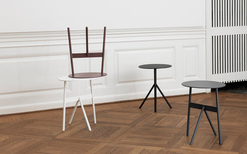 Stock is a collection of small steel tables with an architectural expression. The graphic symmetry of the angled legs adds character to the simple design. Use the light but solid table as a side table in the living room, a nightstand in the bedroom or as a sculptural table in the hallway.