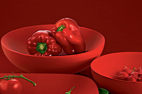 Materials: Double wall bowl in steel coloured with epoxy resin, red with relief decoration.