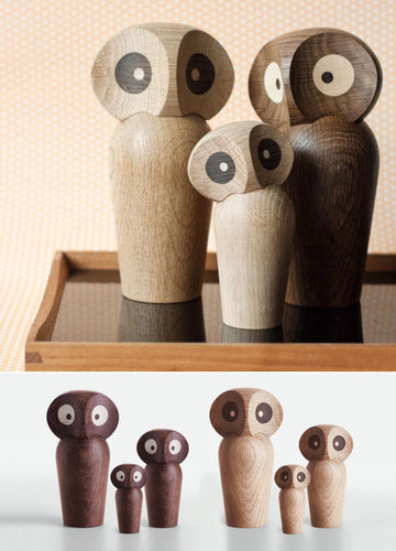 For years, Paul Anker Hansen made the Owl himself. Now, we continue to make it by hand and with the same precision. The body is made in oak wood, and its eyes are inserted with maple and wenge wood. The head has a magnet attached, so it can move seamlessly in multiple directions to create various expressions. It comes in three sizes: Mini, Small, and Large.