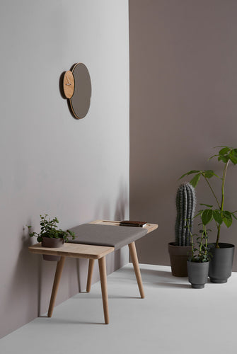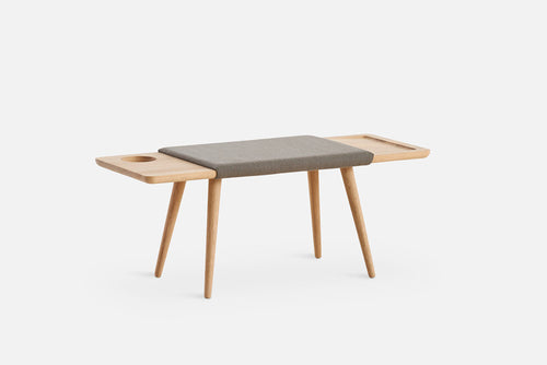 Baenk is a multifunctional bench made of clean minimalistic lines. The bench is made of solid oak with a focus on the unique wooden veins, which give each item a distinctive look. Inspired by the Nordic design traditions, Baenk embraces softness with a modern interpretation of simplicity and functionality. By adding the bench a shelf and a seat, it can be used in multiple contexts and spaces. The circular-shaped hole on the side can be used for an umbrella or plant making it ideal for your hallway or bedroom. Based on the inspiration of an old cardboard embroidery thread bobbins, the middle piece has been upholstered to provide increased comfort. The fabric is carefully selected to complement the structure and shades of the wood.