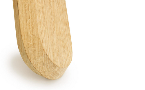 The Ding table is inspired by ancient three-dimensional wooden brain teaser puzzles. The table consists quite simply of three legs made from oak have that are assembled without screws and tools of any kind.When put together they constitute a sculptural knot that works as the base for an exclusive glass tabletop. The legs are rounded off with chamfered edges, making the table stand sturdily on the floor and the round sheet of glass sit solidly on the base. The Ding table is available with either a clear or smoked glass tabletop, and with a choice of three different types of legs, there is ample opportunity to find exactly the style that suits your furnishings and taste. For example, you can combine a clear glass tabletop with legs in natural for a clean and Nordic expression, or turn up the intensity with a smoked table top in bold coral-colored or striking black legs.