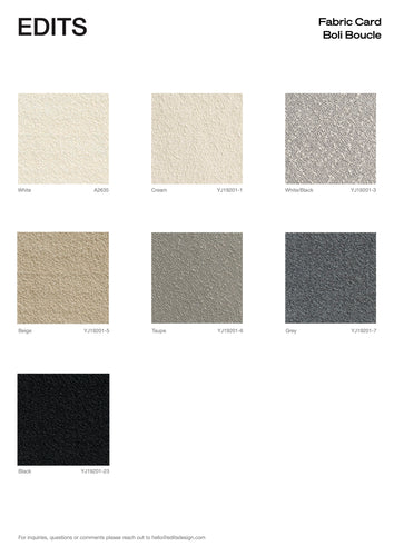 Boli - a chunky boucle exclusive to EDITS. Made from 100% recycled polyester fiber and acrylic, Boli combines contract-grade durability with rich texture and softness. 7 colours.