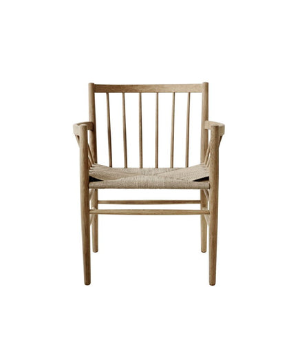 FDB Møbler’s J81 chair, designed by Jørgen Bækmark in 1962, is an attractive wooden spindle back chair based on the 1950s chair collection J80. Featuring an angular frame with distinctive, rounded armrests and back, this solid oak chair is one of the icons of mid-century Danish design. A paper yarn seat complements the natural look of the chair, and its functional form serves many different styles and spaces. The J81 chair shares a similar appearance and materials with other chairs, benches and stools of the J80 collection.