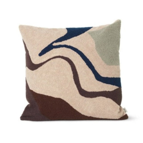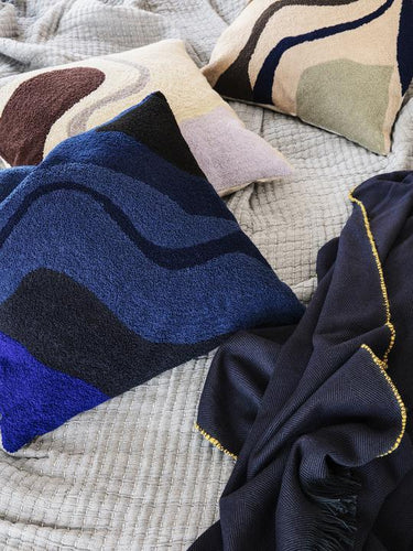 An abstract, timeless design that feels organic yet modern - this line of soft cotton cushions features artful embroidered patterns on the front with a solid-colour backside. The cushion come in three different colourways, all in calm hues with a single bright detail.