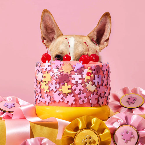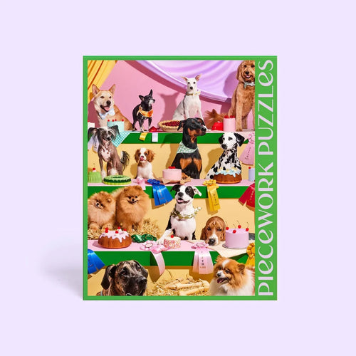 A competition. A baking show. Fourteen friendly doggos. Who will be: Top Dog? Delve into a 1000-piece puzzle filled with pooches proudly presenting decadent desserts. Hot diggity dog!