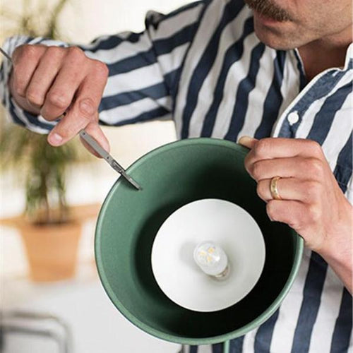 The traditional pendant silhouette receives a poetic reinterpretation with the Grain Lamp. Simple and elegant, the lamp has small grains of fiber in its surface, creating a subtle texture and change in the diffusion of light. The pendant includes an LED lightbulb that lasts for up to 10,000 hours and provides a warm, natural glow.