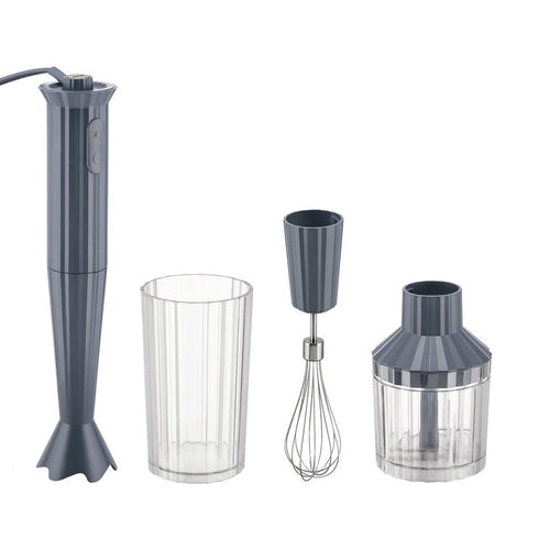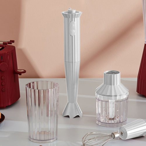Hand blender set with measuring jug, whisk and chopper, all in thermoplastic resin.