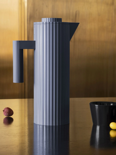 The Plissé thermo insulated jug by Alessi was inspired by the worlds of fashion and architecture. Its three-dimensional surface resembles pleated fabric, and it has a dynamic, sculptural silhouette. Designed by Michele De Lucchi, the Plissé thermo jug is well suited for serving coffee, tea as well as cold drinks, and its double-wall thermal glass inside helps to keep drinks at the desired temperature for longer. Handwash.