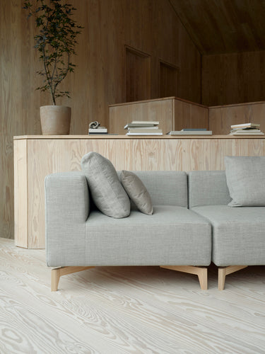 The Passion is a modular sofa system. It is comprised of 3 elements: A corner, single, and a footstool. The elements are purchased individually and are easily combined to create unlimited combinations. It therefore is suitable to both small and large spaces. Each piece is approximately a one meter cube, and therefore they fit together on all sides. For example, the corner can be rotated to be a left or a right. The elements also come with straps which allow them to be held together on the underside.