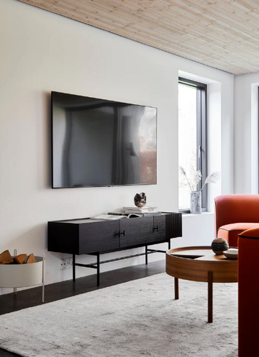 The Array series is inspired by the wooden slate cladding found in modern architecture. With its geometric shape and horizontal slats, it creates a strong visual effect from catching both light and shadow in the depth of the slats. The sleek legs lift the sideboards from the ground creating an elegant contrast between the solid wooden cabinet on top and the thin metal construction underneath. Soft closing doors make the cabinet both functional and delicate.