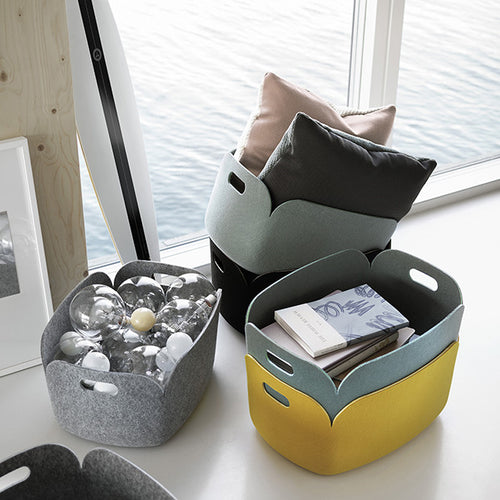 Designer: Mika Tolvanen (2010) Country of Origin: Denmark Manufacturer: Muuto Materials: Wool Felt Why is it special? Designed by Mika Tolvanen for Muuto. The name “Restore” refers to the container’s polymer felt material, which is made from recycling PET bottles. We like that the Restore utilizes innovative and eco-friendly materials while still managing to look approachable and useable. These containers are great for magazines and toys and have been designed to be unobtrusive and friendly. The containers are strong enough that they hold their shape, but soft so they won’t scratch surfaces.