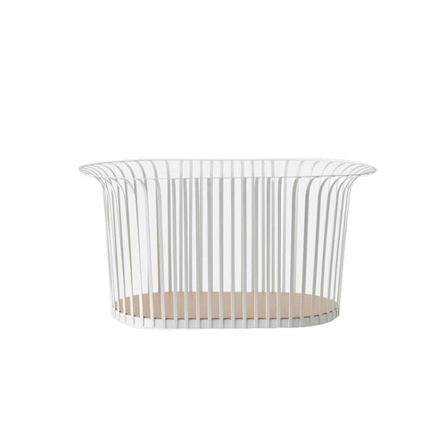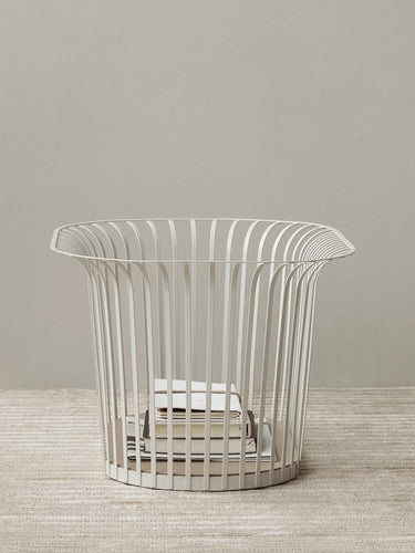 A modern storage solution with a traditionalist feel, the Ribbon Basket contrasts sleek powder coated steel with soft, inviting curves. Crafted with precision, vertically positioned metal strips are formed into a gently rounded lip that makes it easy to carry the basket from room to room. Cushioned on the bottom with tonal leather for an exclusive feel and elevated on silicone feet for stability and protection, it adds instant graphic appeal to a room, as a practical and decorative home for magazines, home textiles, accessories and more.