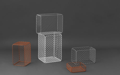 Track is comprised of diagonal steel rod tracks that form a minimalist and airy construction. The tracks run in opposing directions on each side, thereby creating a fine pattern of small squares when you look through the basket. You can create new expressions by placing the baskets inside one another, and when the baskets are full, the sporty, diagonal pattern of the mesh becomes apparent.