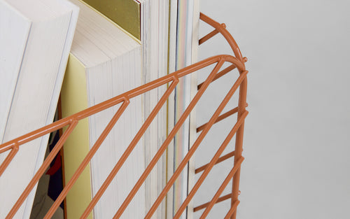 Track is comprised of diagonal steel rod tracks that form a minimalist and airy construction. The tracks run in opposing directions on each side, thereby creating a fine pattern of small squares when you look through the basket. You can create new expressions by placing the baskets inside one another, and when the baskets are full, the sporty, diagonal pattern of the mesh becomes apparent.