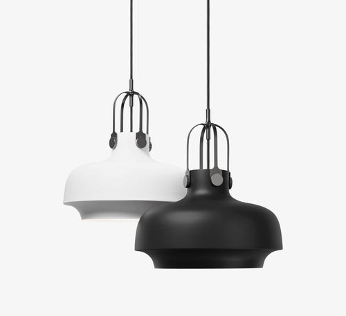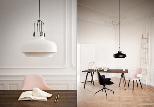 The Copenhagen Pendant is a fabulous hanging ornament of a light. With its maritime antecedents it appears to have a long history but is in fact a very recent design. Conceived by Space Copenhagen for &Tradition the lamp is intended to resemble the top of a classic gaslight once common along Copenhagen’s piers. The lamp carries its weight easily, industrial yet highly sophisticated the Copenhagen casts a wonderful diffuse down light as well as an uplight which softly illuminates the hanging structure. This structure is elongated and delicate with large circular fixings and its polished finish contrasts beautifully with the matt solidity of the lamp shade with its combination of curves and linear folds. The Copenhagen comes in three sizes with this the smallest available in five matt shades, blush, moss, slate, white and black, the medium in matt black or white and the large in black only. In the realm of industrial illumination the Copenhagen Pendant offers a thoroughly modern take on its predecessors, solid, permanent and yet light.