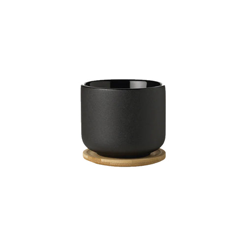 The Theo tea mug is made of blackish-brown stoneware, in the same style as the simple, Scandinavian, clean lines of the teapot. The mug has a bamboo coaster, which adds a warm, tranquil touch. Avoid cup rings on the table with this sustainable, Asian bamboo coaster.