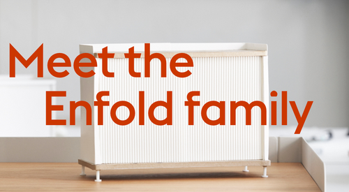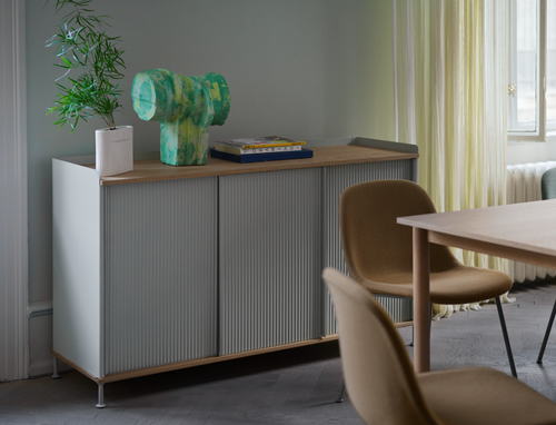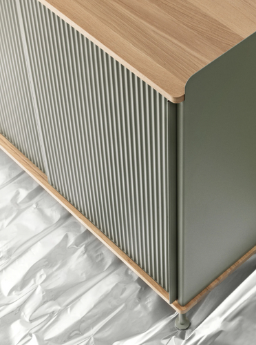 The Enfold Sideboard combines industrial materiality with residential references for a new perspective on modern storage. Made from a lacquered steel that gently enfolds its top and bottom in solid oak, the Enfold Sideboard fuses cold and warm materials for a unique expression, paired with the vibrantly modern expression of its ridged steel doors. The flexible design is available in four sizes, which all have adjustable shelves and discreet cable outlets. This offers the opportunity to find just the right fit for your space, function and needs — be it a media console, in the hallway or a tall sideboard for storage.