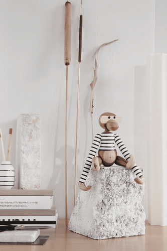 Kay Bojesen is synonymous with original Danish design. And the collaboration with Mads Nørgaard unites the love of durable and long-lasting products, while adding the playfulness and quirky quality that Kay Bojesen loved to add to his designs to spark the imagination and create original stories made of wood. The iconic Monkey in new clothes is a fun and unpretentious celebration of both design icons, where with a twinkle in the eye we come together to pay tribute to the humour and smiling lines with colours and stripes that go far back in Danish design history.